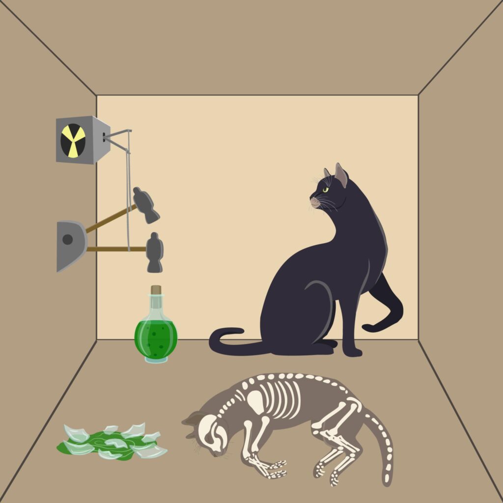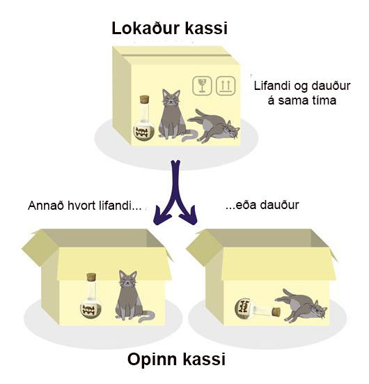 Austurríski eðlisfræðingurinn, hugsuðurinn og Nóbelsverðlaunahafinn Erwin Rudolf Josef Alexander Schrödinger setti fram þá undarlegu kenningu að ef líf kattar í lokuðum kassa væri undir því komið hvort ákveðin geislavirk eind með vissan helmingunartíma klofnaði eða klofnaði ekki á tilsettum tíma, þá væri ógjörningur að vita fyrirfram (þ.e. áður en gáð er í kassann) hvort kötturinn væri lífs eða liðinn. Hið undarlega er að skv. kenningunni gæti kötturinn verið dauður, sprelllifandi eða hálfdauður. Ekki nóg með það, kötturinn gæti verið allt þetta á sama tíma!